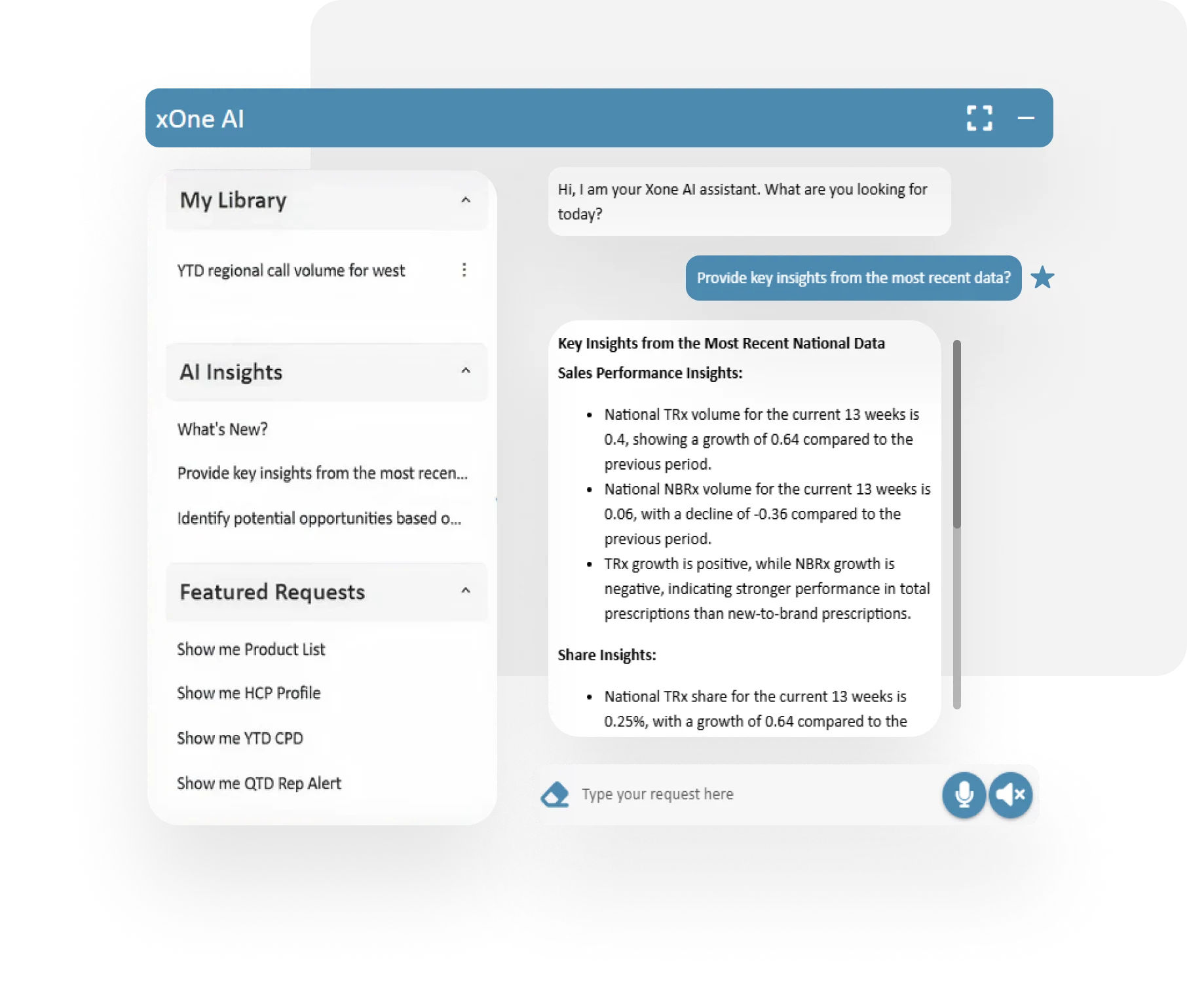 Finally, the days of painstakingly hunting through charts and menus to compile data are over. Only have 5 minutes before detailing a new HCP? Simply ask questions and find what you’re looking for in seconds.